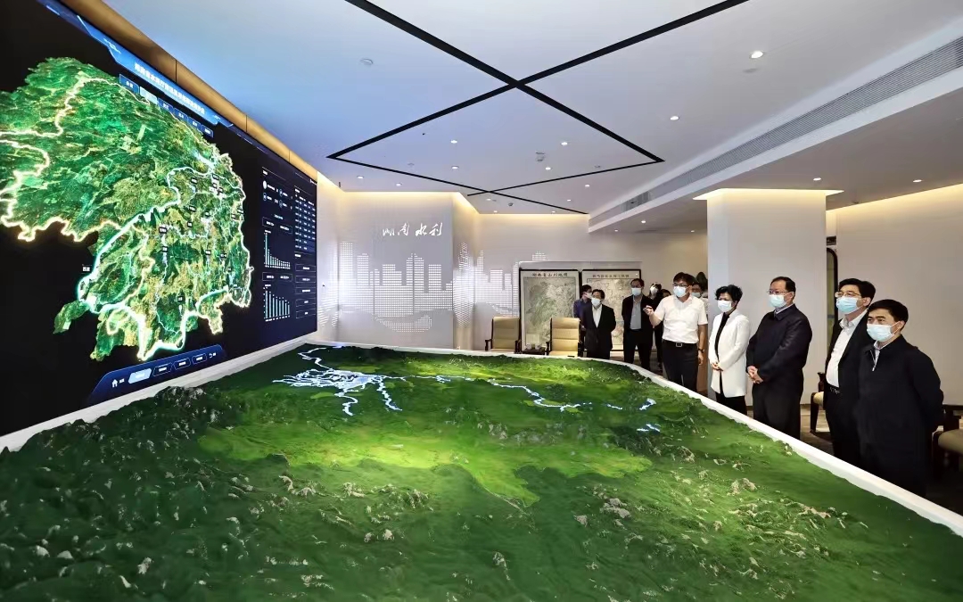 (毛伟明考察全省防汛抗旱沙盘模型。)