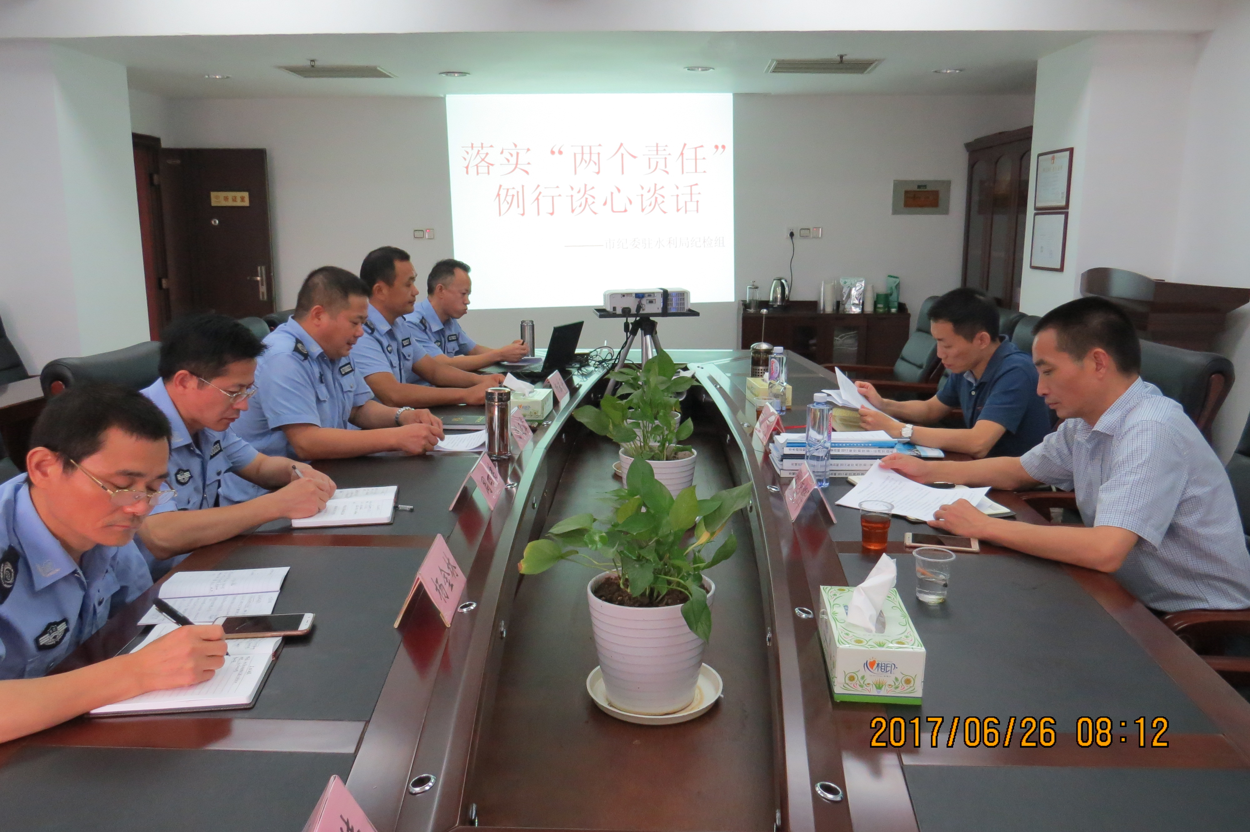 6月26日上午,市纪委驻市水利局纪检组组长邹凯、副组长罗晓辉到市水政监察支队开展落实“两个责任”例行谈心谈话活动。
