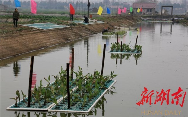 固定在环湖沟渠中的生态浮岛,浮岛上种植的鸢尾、矮株美人蕉等植物的根系将吸收水体中的富营养化物质。