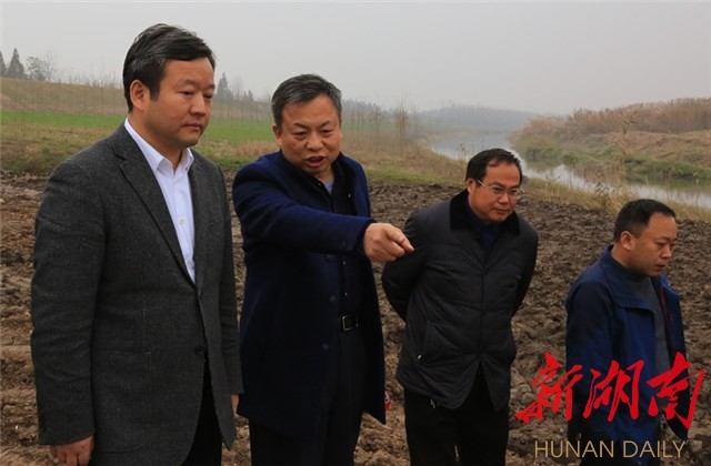 常德市委副书记、代市长曹立军(左一)在珊珀湖水污染综合治理工程现场督导。