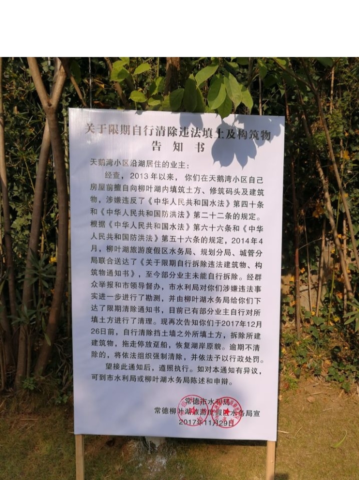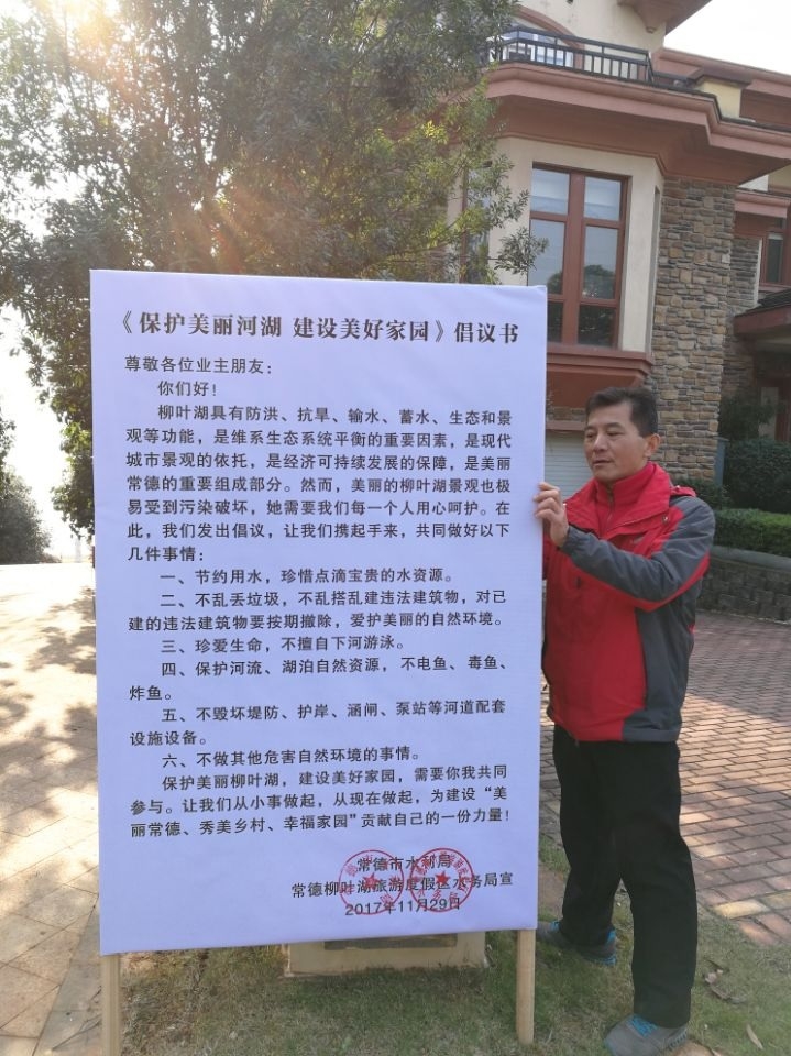 围绕业主“自行拆除”与“集中攻坚、拆出声势”的目标要求。12月8日市水利局、柳叶湖水务局水政监察执法人员,在天利物业公司管理人员的配合下,在沿湖主干路面张贴自行拆除告知书及共同保护秀美柳叶湖倡议书等宣传展板。