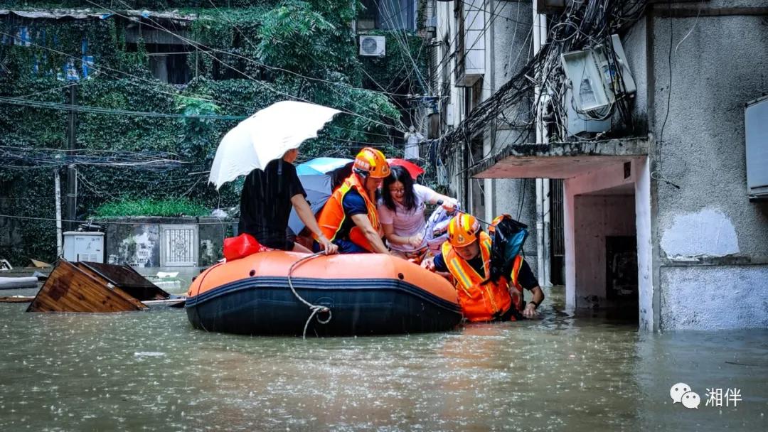 2020年7月8日,岳阳市岳阳楼区三眼桥街道学院路华菱融域附近小区,消防指战员在转移被困群众。李战 何俊彦 摄