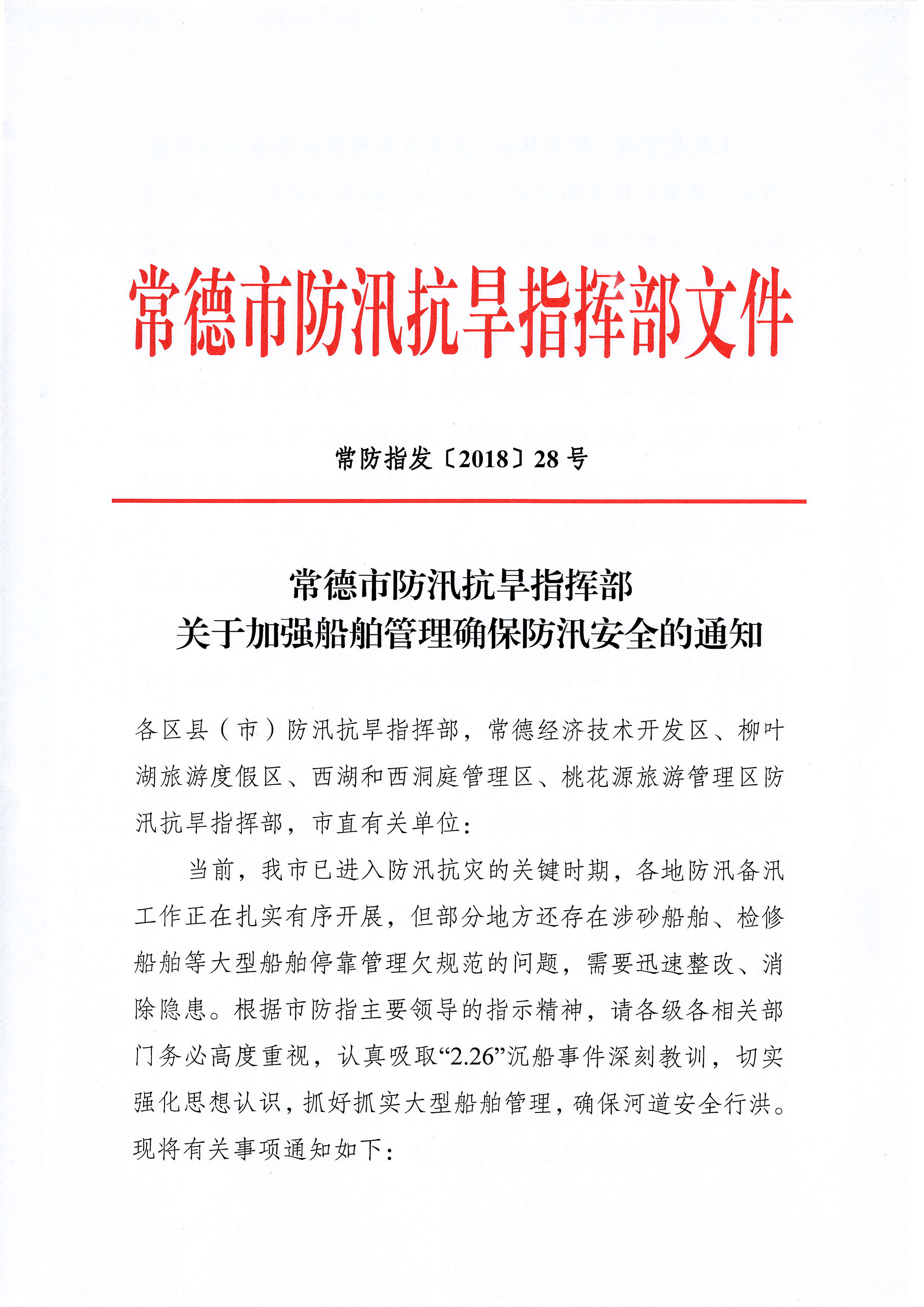 常德市防汛抗旱指挥部关于加强船舶管理确保防汛安全的通知