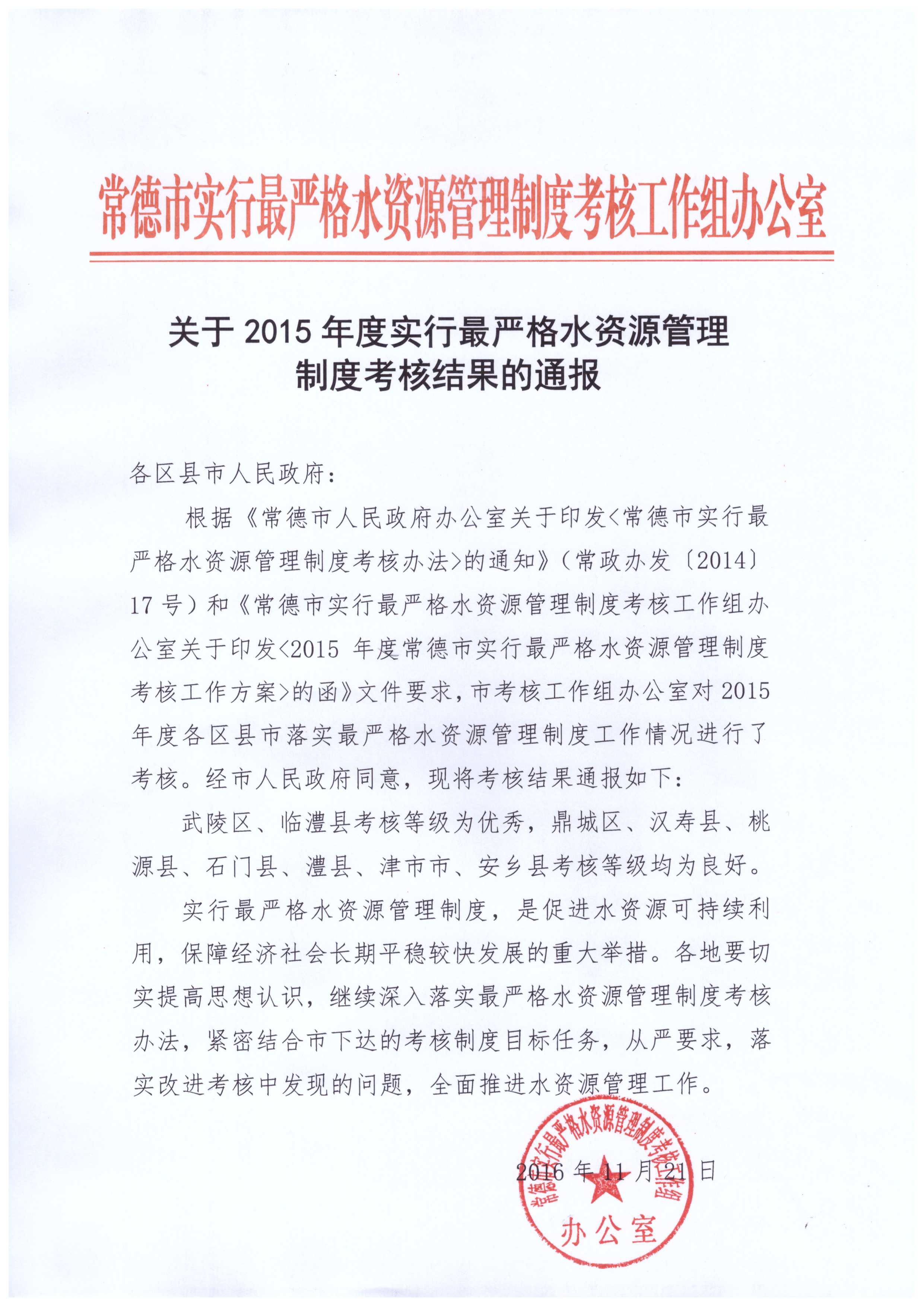 常德市关于2015年度实行最严水资源管理制度考核结果的通报