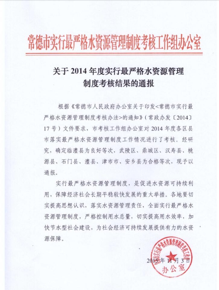 常德市关于2014年度实行最严格水资源管理制度考核结果的通报