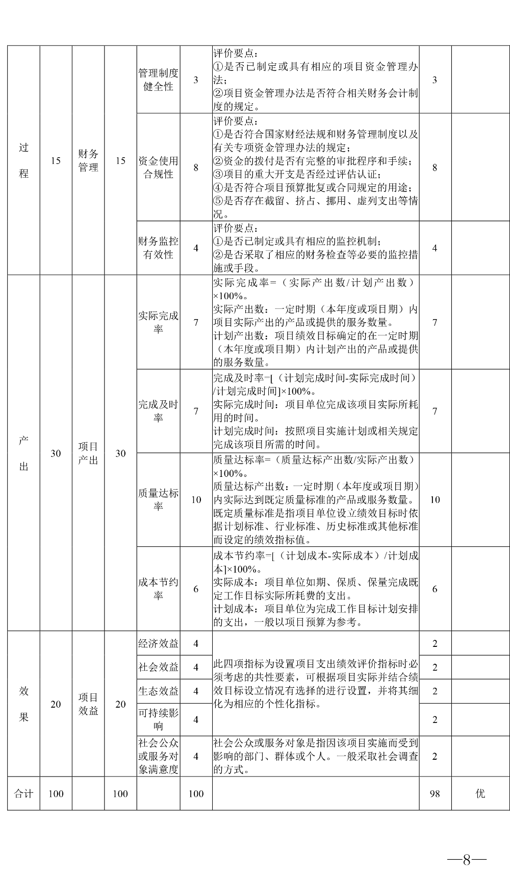 项目立项规范、绩效目标合理、绩效指标明确、资金落实较及时且使用合规合法、业务管理制度健全且执行有效、项目完成较为及时且质量控制较好,均达到了良好的经济、社会、生态效益,人民群众对水资源专项项目的实施满意度高,项目支出绩效评价总得分98分(详见附表),2016年度水资源专项自评结果为“优”。