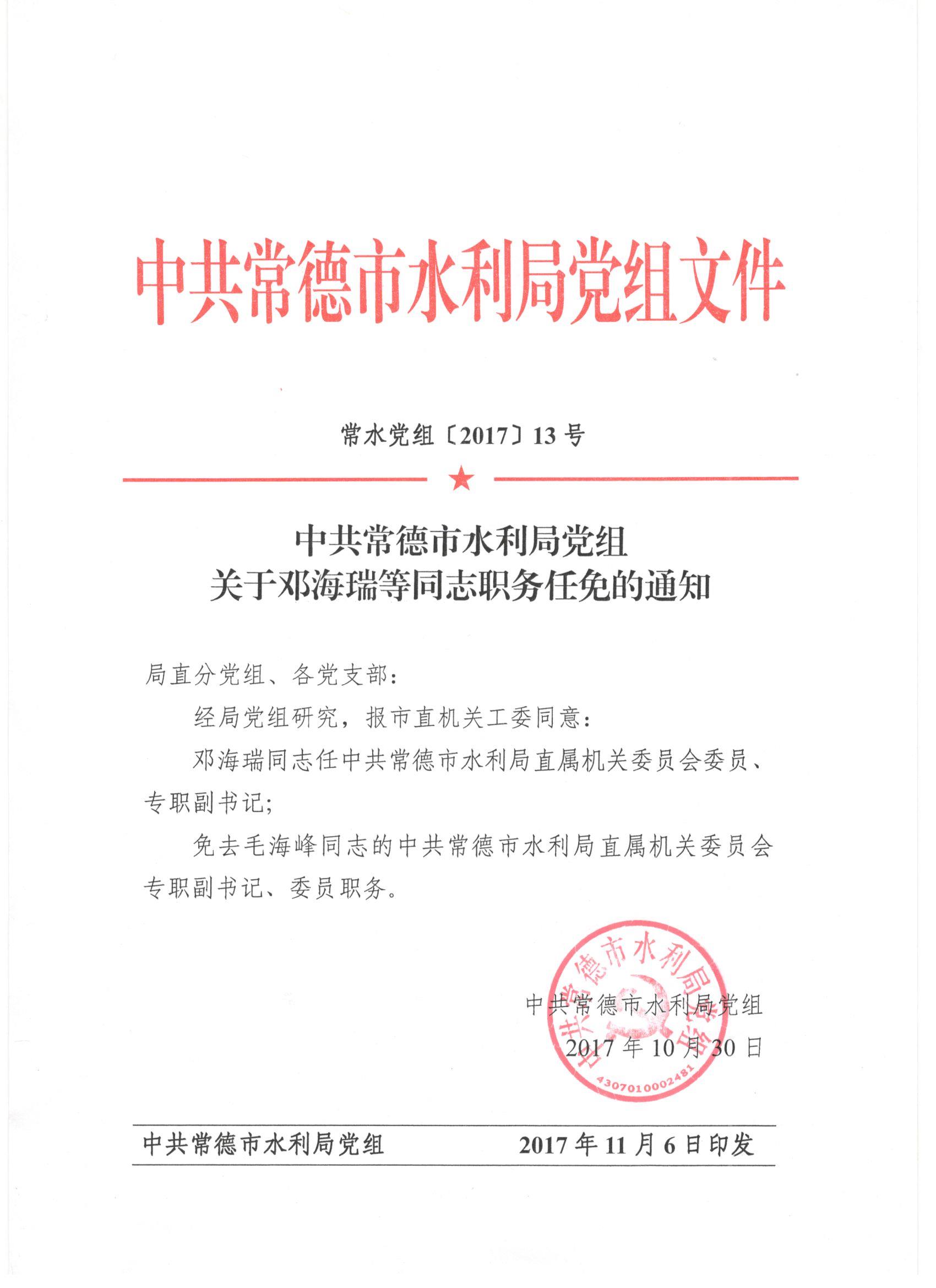 中共常德市水利局党组关于邓海瑞等同志职务任免的通知